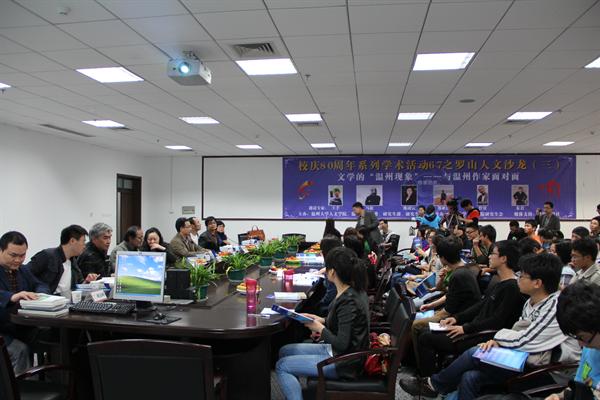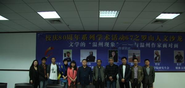 2013年5月8日下午2:00,校庆80周年系列活动之罗山人文沙龙(三)在永利yl23411官网入口育英图书馆B213隆重举行,其主题是“文学的‘温州现象’——与温州作家面对面”。此次活动由永利yl23411官网、团委、研究生部、研究生会联合主办,由永利yl23411官网研究生会承办,并得到了《温州晚报》、《永利yl23411官网入口报》等媒体的大力支持。本次学术沙龙由永利yl23411官网副院长孙良好教授主持,出席的嘉宾有国家一级作家、浙江省作协副主席、温州市文联主席与作协主席王手,“原散文”代表作家、浙江省散文创委会副主任、温州市作协副主席马叙,“中生代”代表诗人、首届《十月》诗歌奖获得者池凌云,在音乐与文学中自由穿梭并教授英语的作家郑亚洪,首届《人民文学》新人奖获得者、温州市作协副主席哲贵,第二届郁达夫短篇小说奖获得者、温州市作协副主席东君,永利yl23411官网文艺学教研室主任胡友峰教授、写作学硕士点负责人陈小碧博士、《永利yl23411官网入口学报》付昌玲老师也参加了本次沙龙。