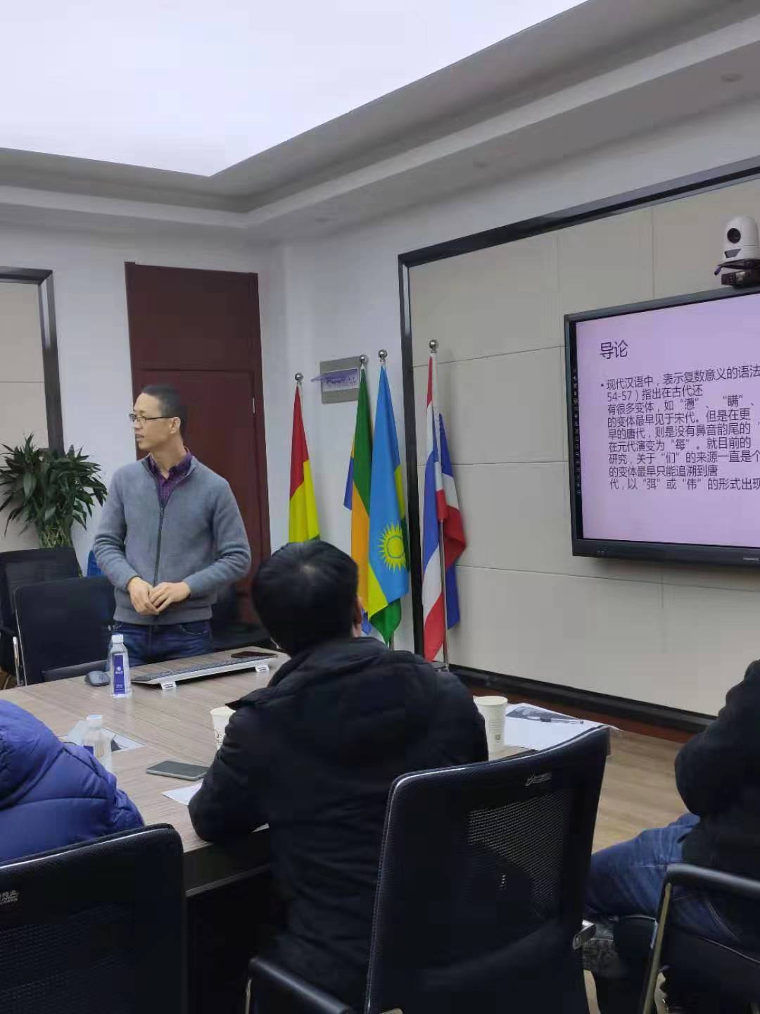第二位学术分享的叶晓锋老师带来的论文题为《佛教传入与复数标记“们”》,在这篇文章中叶老师重点讲述了自己对于“们”在语言学上的新发现。伍三土老师高度赞扬叶老师博览群书,跨学科学习和探索的精神,也提出了在文章的铺垫上应该再做进一步的补充,可在文章发表后方便大众的阅读的意见。陈勇老师及在座的诸位老师对他的创新发现高度赞赏。