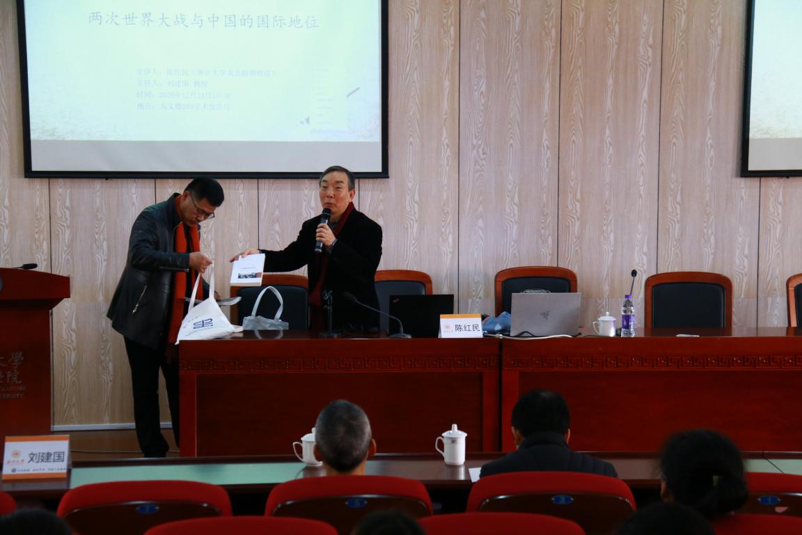 讲座伊始,公司刘建国教授对陈红民教授作了简要介绍,而后陈红民教授向公司赠送了《蒋介石的后半生》《什么是最好的历史学》等著作、论文集以及自制蒋介石与近现代中国研究中心十周年纪念册等。
