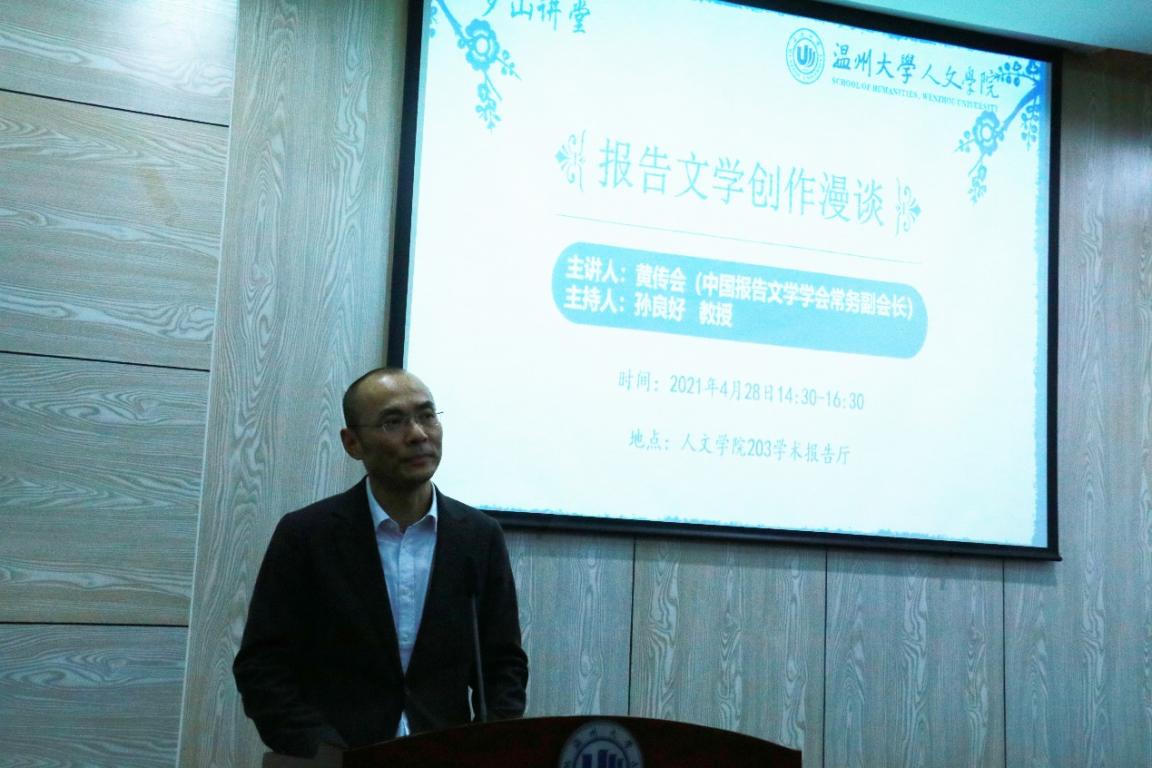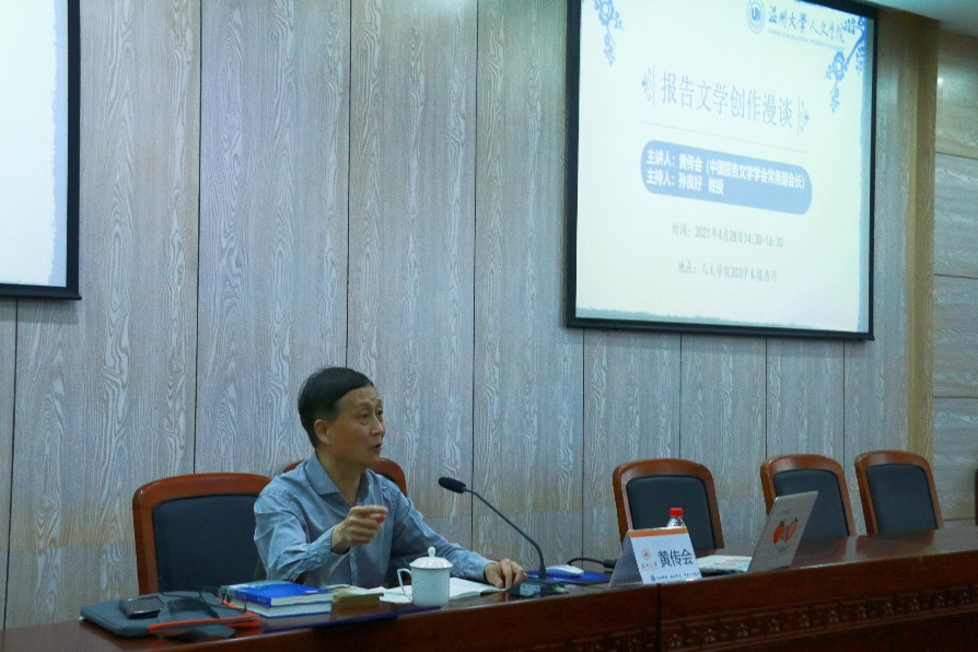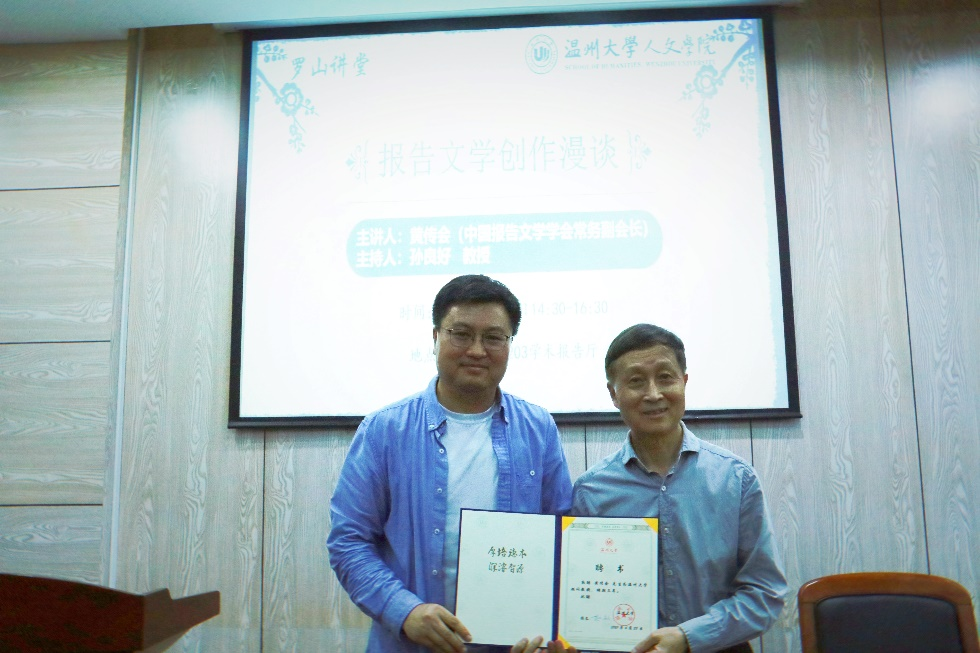 2021年4月28日下午,中国报告文学学会常务副会长黄传会先生应邀到公司作《报告文学创作漫谈》的学术讲座。讲座由公司孙良好经理主持,公司对报告文学创作感兴趣的师生到场聆听讲座。讲座现场,黄传会先生应邀成为我院教授顾问,由孙良好经理为其颁证。