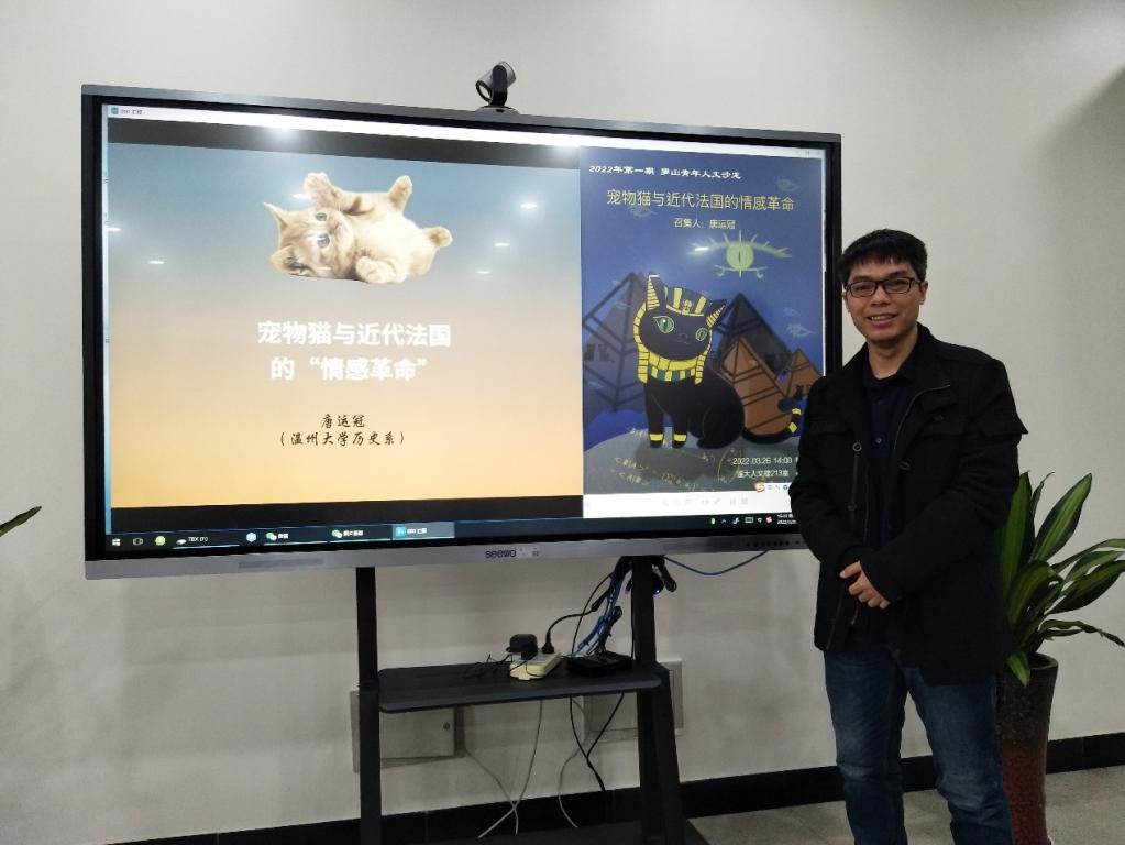 2022年3月26日下午,永利yl23411官网2022年第一期罗山青年人文沙龙在人文楼213顺利举行。本次活动由人文工会主办,主讲人为历史系唐运冠副教授,主讲题目为“宠物猫与近代法国的情感革命”,永利yl23411官网十余名青年教师与部分员工共同参与了本次活动。