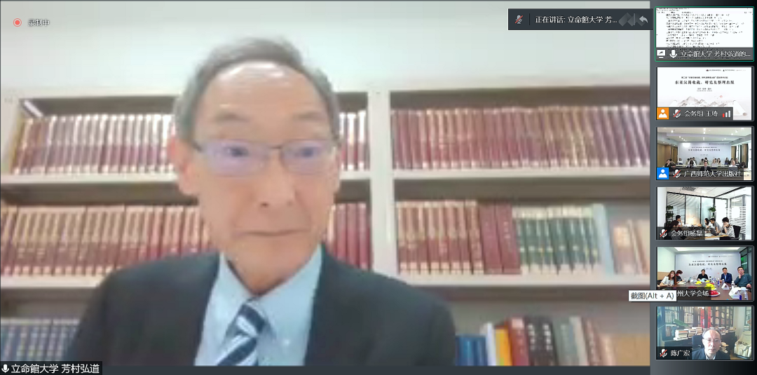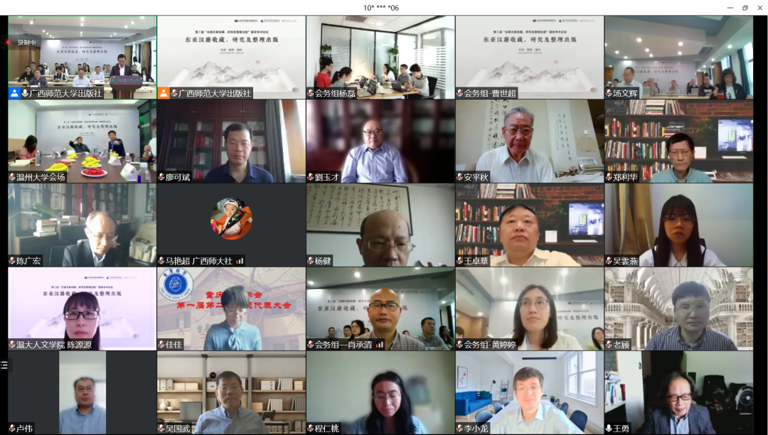 2022年5月21日至22日,由北京大学中国古文献研究中心、广西师范大学出版社集团有限公司主办,公司协办的第二届“古籍文献收藏、研究与整理出版”国际学术论坛之“东亚汉籍收藏、研究与整理出版”研讨会,以线上、线下相结合的方式召开,在北京、桂林、温州三地设立分会场。会议开幕式由广西师范大学出版社集团有限公司总编辑汤文辉编审主持,全国古籍整理出版规划领导小组副组长、全国高校古委会名誉主任、北京大学中国古文献研究中心安平秋教授,广西师范大学出版社集团有限公司董事长黄轩庄教授,永利yl23411官网副经理陈源源教授先后致辞。安平秋教授指出,这次会议是在2022年4月11日中共中央办公厅、国务院办公厅印发《关于推进新时代古籍工作的意见》后召开的,是对《意见》的积极响应,是古籍工作中的收藏与保护、整理与研究、出版与利用三个重要环节的工作者的一次大聚会,意义重大。
