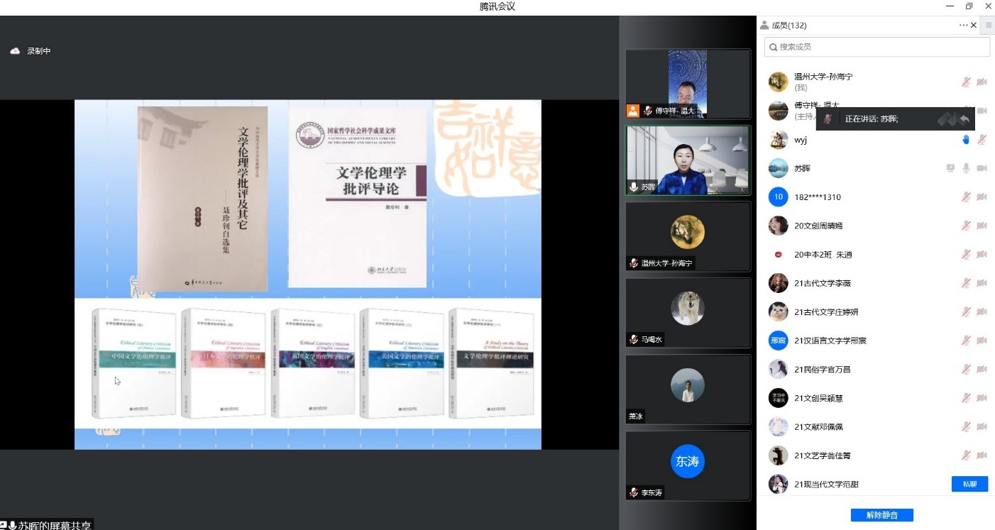 2022年5月26日9时,华中师范大学文公司教授、博士生导师,《外国文学研究》杂志主编苏晖教授应公司邀请,通过线上方式做了题为“伦理智慧与伦理选择——关于文学伦理学批评核心范畴的思考”的学术演讲。本次讲座由公司傅守祥教授主持,与会者除公司各专业研究生外,还有北京大学、南京大学、武汉大学、河南大学等校师生参加,人数达到150多人。