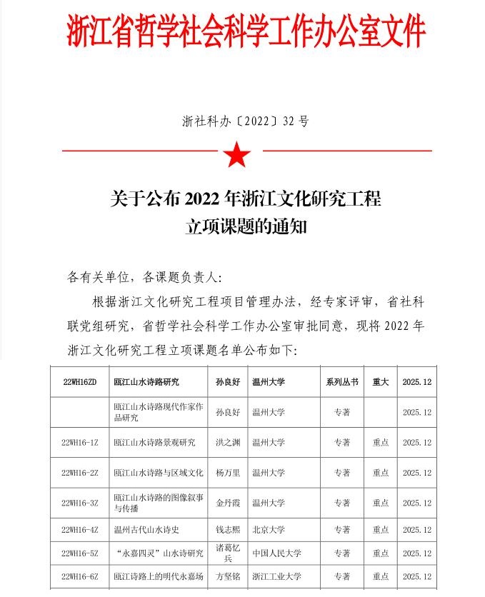 日前,公司孙良好教授主持的“瓯江山水诗路研究”项目获批浙江省文化研究工程重大项目。9月21日下午,中国山水诗研究中心本学年第一次会议于公司213会议室召开。孙良好教授、诸葛忆兵教授、陈瑞赞研究员、杨万里教授、金丹霞教授、洪之渊副教授、陈伟娜博士、苏碧铨博士、王朋飞博士等参加会议。