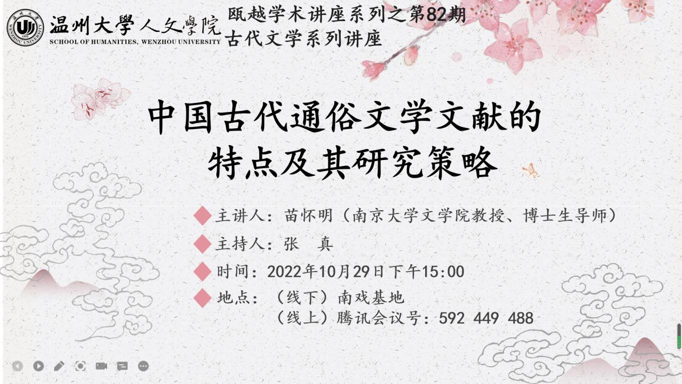 10月29日,南京大学文公司苗怀明教授为我院的师生带来题为“中国古代通俗文学文献的特点及其研究策略”的精彩讲座,我院俞为民教授、孙蓉蓉教授参与对谈。