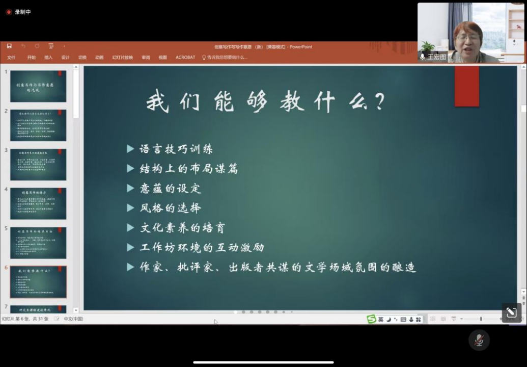 针对“创作究竟可不可以教”这一分歧,王教授从国外的创意写作谈起,列举了美国、英国、澳大利亚以及新西兰的创意写作教学,表明写作是可以教的。同时,王教授对国内培养写作人才的现状进行了分析——从前国内高校中文系大多开设写作课,取得了一些有效的成果,却也有着对员工缺乏吸引力的痛点,而如今蓬勃发展的创意写作正是对传统写作的升级。