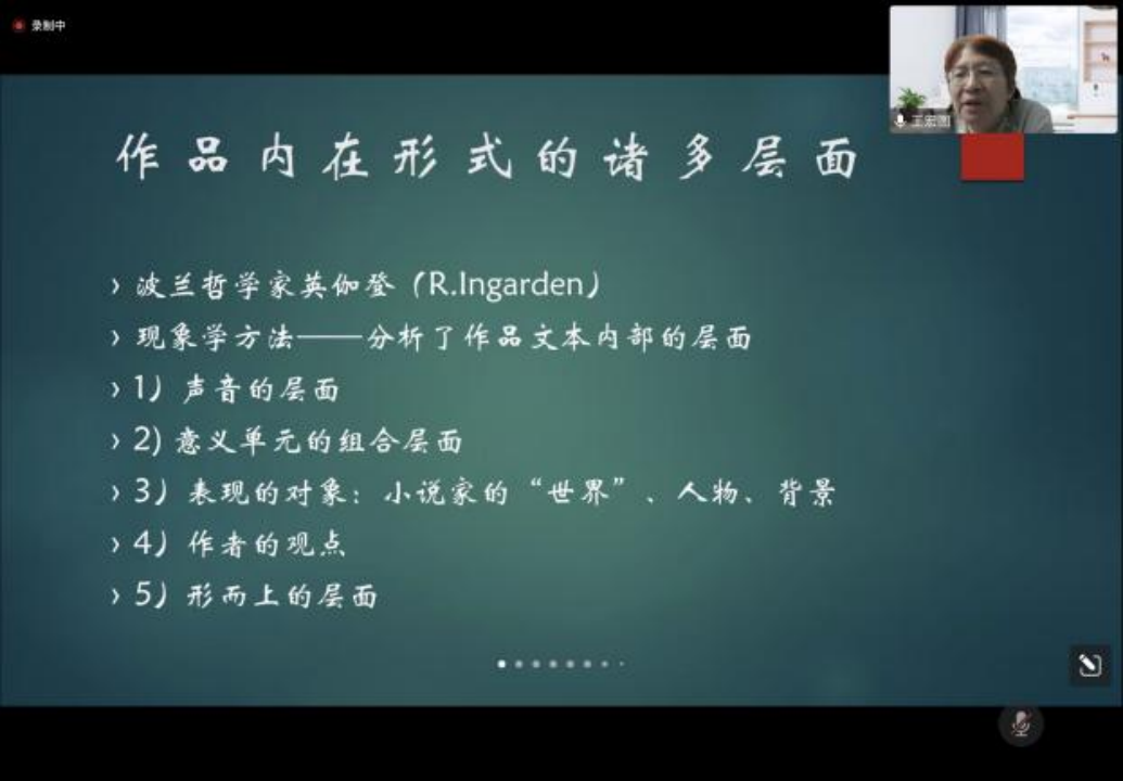 王教授提倡运用现象学方法,分析作品文本内部的层面——声音、意义单元的组合、表现的对象、作者的观点、形而上的层面。于声音而言,诗歌的节奏格律是表现得较为明显的;在叙述性作品中,作者将设计的声音演化成词语跟段落的意义单元。此外,王教授也在韦勒克文本分层中举例说明了诗歌对于意象和隐喻的典型演绎。