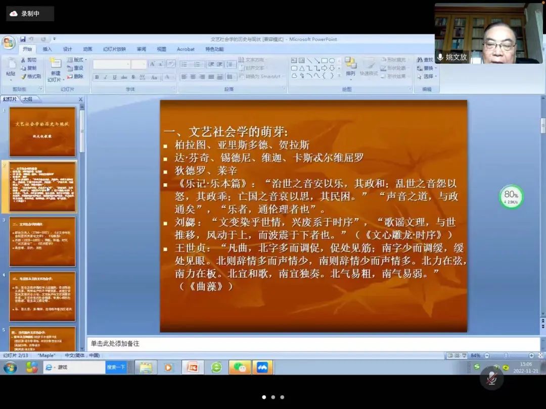2022年11月21日15点,扬州大学文公司教授、博士生导师姚文放老师受邀为公司师生带来了一场题为“文艺社会学的历史与现状”的精彩讲座,公司刘毅青教授主持。
