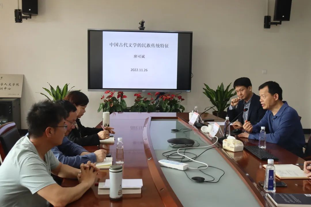 2023年4月21日上午,北京大学中文系教授、长江学者特聘教授、北京大学中国古文献研究中心主任廖可斌教授应邀在公司213学术交流中心作了题为“中国古代文学的民族特征与研究方法”的学术讲座。讲座由公司侯荣川教授主持,孙良好经理、罗筱玉教授、杨万里教授等参与。