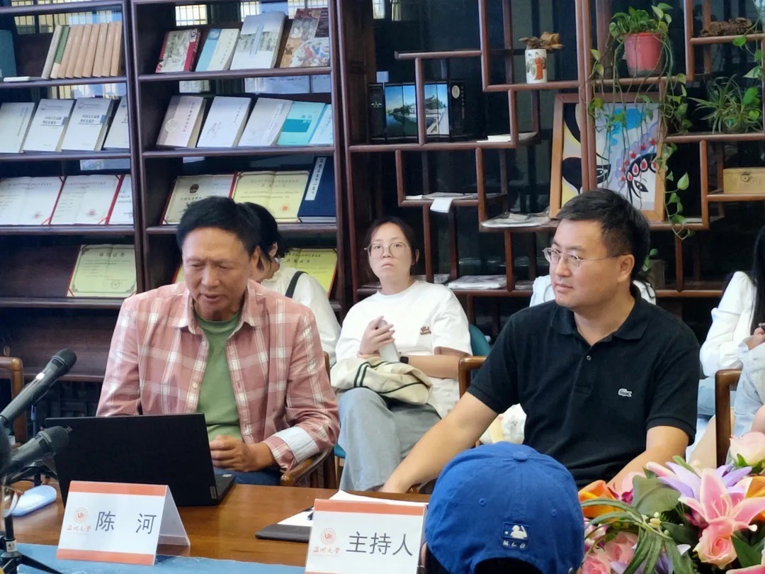 陈河老师对于故土情节、生命体验、创作心得等感性经验的讲述唤起了在座员工对文学温州书写的别样感受。孙良好老师对陈河老师的精彩演讲进行了提纲挈领的总结,认可其作品在近现代温州人文书写的重要作用。方韶毅老师就地方书写、历史写作、女性塑造等角度,与陈河老师进行了对话。鲍良兵老师则是从文学史角度出发,谈及《误入孤城》该部小说在乡绅人物塑造、地方史、商业现代性方面的文学史贡献。现场中文系研究生们也分享了自己的感悟,并从陈河小说的“互文性”角度、女性主义角度提出自己的疑问,陈河老师耐心地进行了解答。整场讲座在轻松愉悦的氛围中结束。