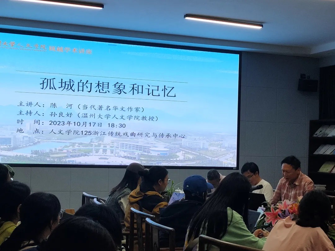 2023年10月17日晚,当代著名华文作家陈河应邀在公司125浙江传统戏曲研究与传承中心举行了题为《孤城的想象和记忆》的讲座。本次讲座由公司经理孙良好教授主持。