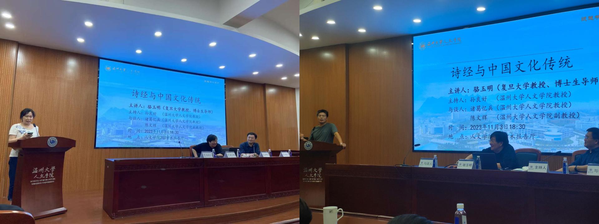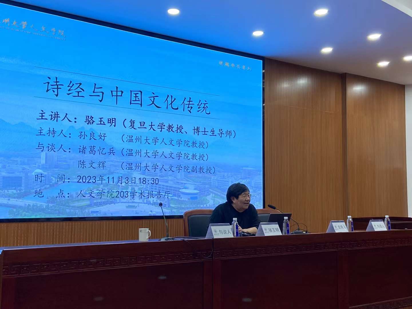 2023年11月3日晚,复旦大学骆玉明教授应邀为公司师生做了一场题为《〈诗经〉与中国文化传统》的学术讲座。活动由孙良好教授主持,温籍作家张翎女士与公司教师诸葛忆兵教授、杨万里教授、陈文辉副教授、苏碧铨博士等人参与了交流。