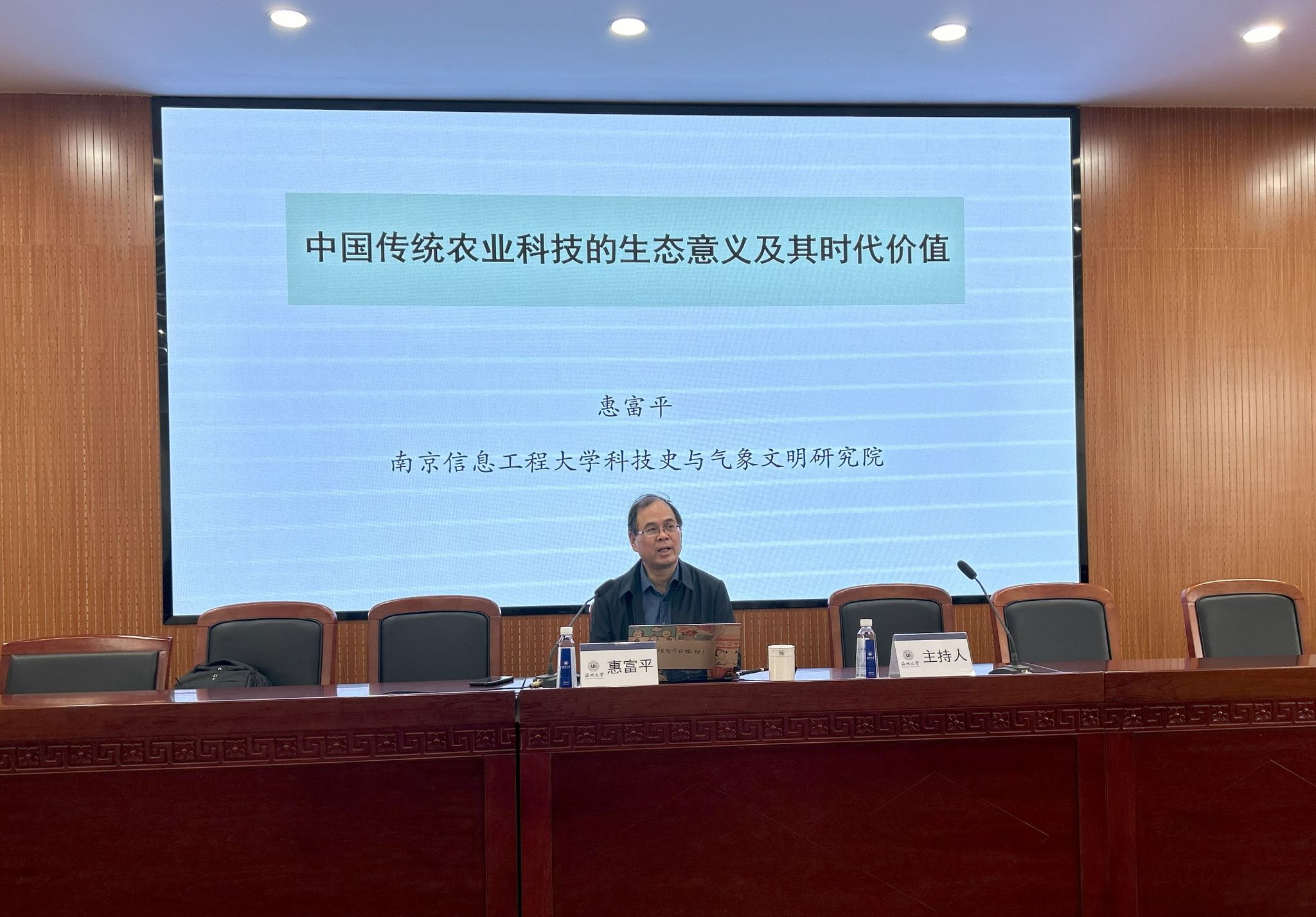 2023年12月8日上午,南京信息工程大学科技史与气象文明研究院惠富平教授应邀在公司学术报告厅举行了题为《中国传统农业科技的生态意义及其时代价值》的学术讲座。本次讲座由公司邱志诚教授主持,历史学及相关专业本科生、研究生40余人参加了讲座。