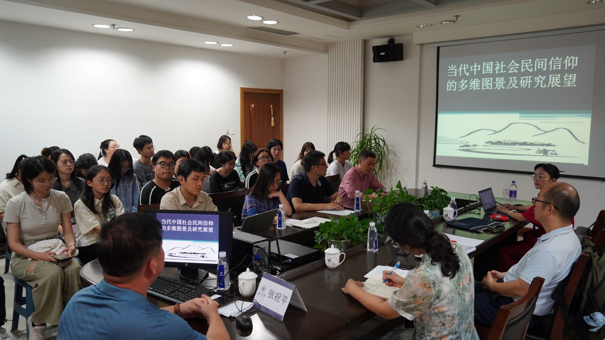 张教授的讲座基于文献研究、田野调查、政府政策的三重进路,多维度、多视角、多层面地对当代中国社会民间信仰的变迁图景、现实图景和趋势图景进行了深入探讨。张教授从20世纪乡村建设的话题导入主题,系统地梳理了近百多年来中国民间信仰与中国社会发展变迁同频共振的历史轨迹。他指出,从民间信仰在不同历史时期的演变中,可以感受到了民间信仰与中国社会发展紧密相连的脉动。因此,我们应该秉承“与时代共振”、“ 守正不守旧,遵古不复古”的观点,客观、全面地看待民间信仰的性质与作用。