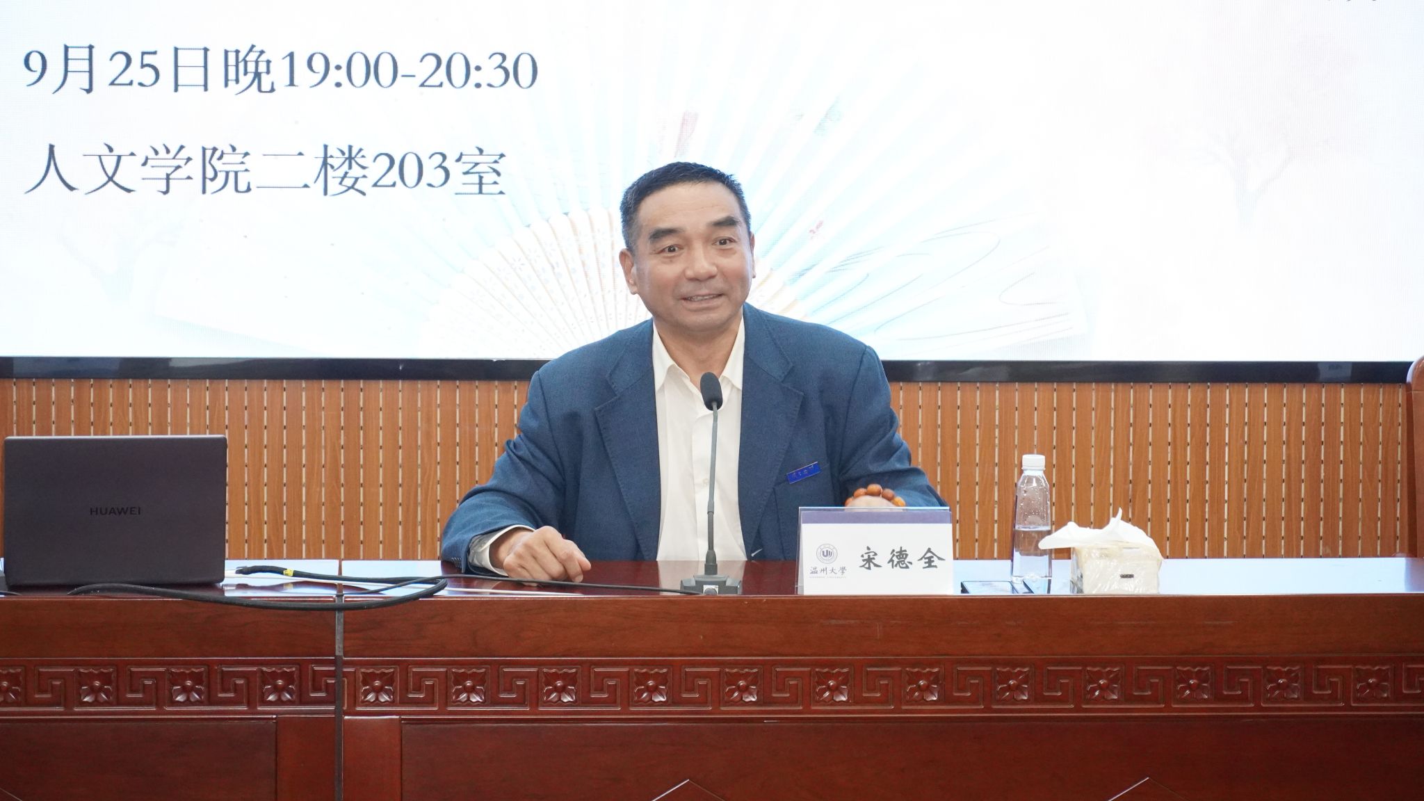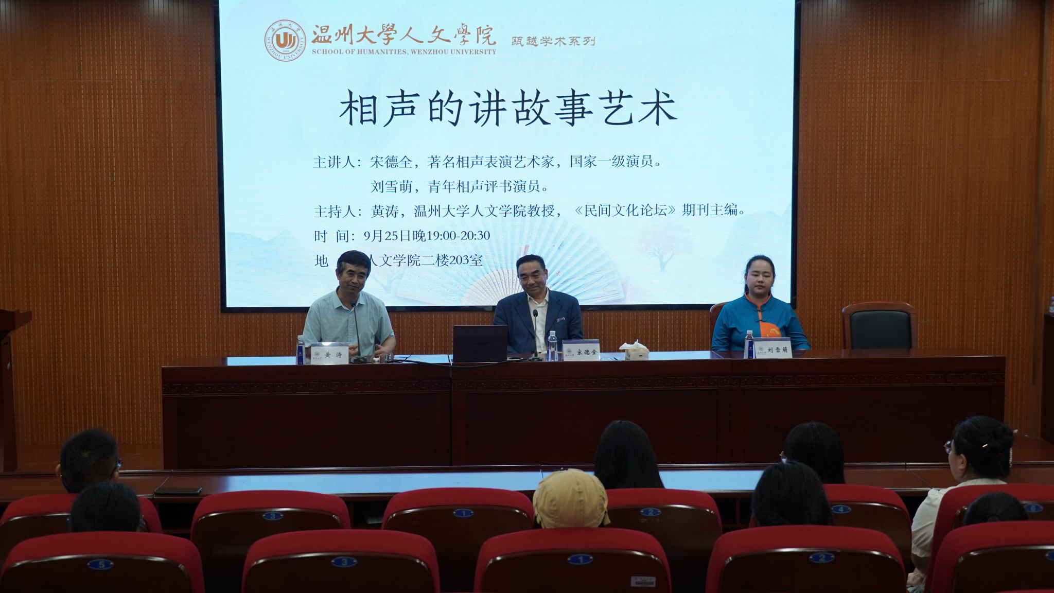 2024年9月25日晚,著名相声表演艺术家,国家一级演员,宋德全先生和青年相声评书演员刘雪萌女士,应永利yl23411官网、温州民俗博物馆邀请,在公司203学术报告厅,作了一场题为“相声的讲故事艺术”的学术讲座。本次讲座由黄涛教授主持,程安霞老师、王辉老师,温州市委党校胡正裕老师出席,公司各专业研究生、本科生积极参加。
