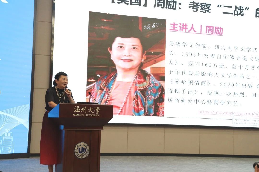 美国华人作家周励的演说主题为“考察‘二战’的血与火”。周励以自己在北纬90度参加跳水冰泳的故事勉励青年朋友勿要“躺平”,需用激情拥抱生活。她重点论述了其与二战有关的历史书写,周励以史学家的精神和文学家的激情发掘那些近乎被遗忘的二战事件,以恢弘的书写和逼近心灵的拷问警醒世人维护和平,其近十万字的战争灾难文学辑录于作品《亲吻世界——曼哈顿手记》中。周励阐述了其写作生发的缘由——爱游泳的周励在一次浮潜时意外发现了海底的战船残骸,经由大量考察和走访,她深刻认识到与战船相关的贝里琉岛战役的残酷,希望在灾难的历史中探究可贵的人性光辉,呼吁人类珍惜和平。