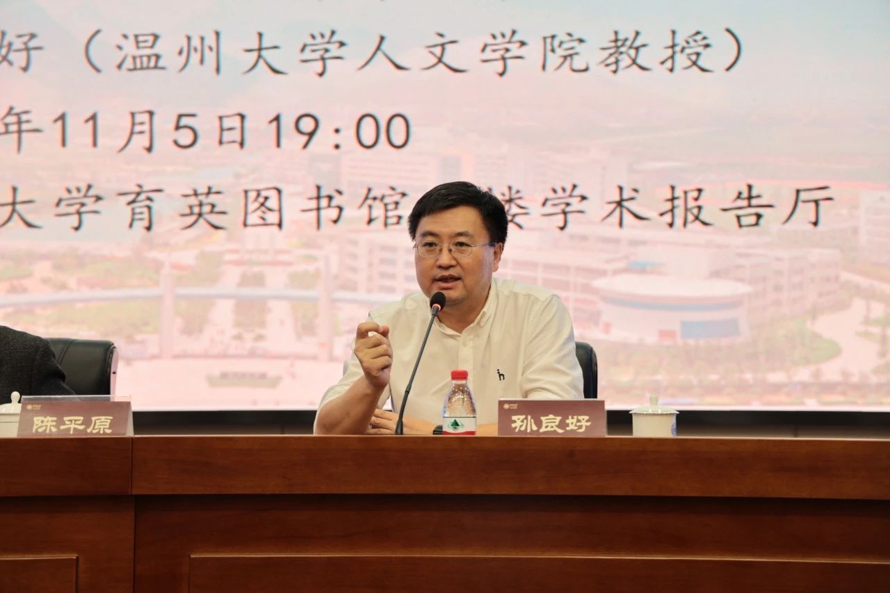 主持人孙良好教授用“十年之约”“联袂而来”“三位一体”三个词介绍了陈平原教授与罗山讲堂的因缘。第一,“十年之约”是指陈平原教授接受了孙良好教授十年之约的邀请,自2014年春天做客罗山讲堂后,再一次来到了永利yl23411官网入口;第二,“联袂而来”是指陈平原教授与夏晓虹教授这对中国文学研究界的“神雕侠侣”,自2014年4月15日晚上在温大图书馆分别以“烽火连八年,弦歌抵万金——中国大学西迁的历史及精神”和“二十世纪秋瑾文学形象的变迁”为题讲演后,再次联袂来到永利yl23411官网入口。第三,孙良好教授认为陈平原教授是集文学、大学、读书为一体的学者,他说:“陈平原教授是国内少有的文科一级教授,不仅是文学研究的大家,也是大学研究的大家,还有很多与读书相关的著述。在我看来,文学、大学、读书在陈老师身上是三位一体的,是水乳交融的。”
