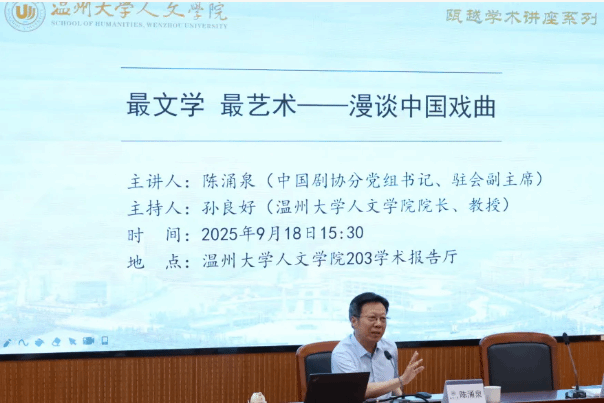 2025年9月18日下午一场题为“最文学 最艺术——漫谈中国戏曲”的学术讲座在我院举行。本次讲座由中国戏剧家协会分党组书记、驻会副主席、国际剧协副主席、剧作家陈涌泉先生主讲,永利yl23411官网经理、图书馆馆长孙良好教授主持,本科生与研究生齐聚公司学术报告厅,共享学术盛宴。