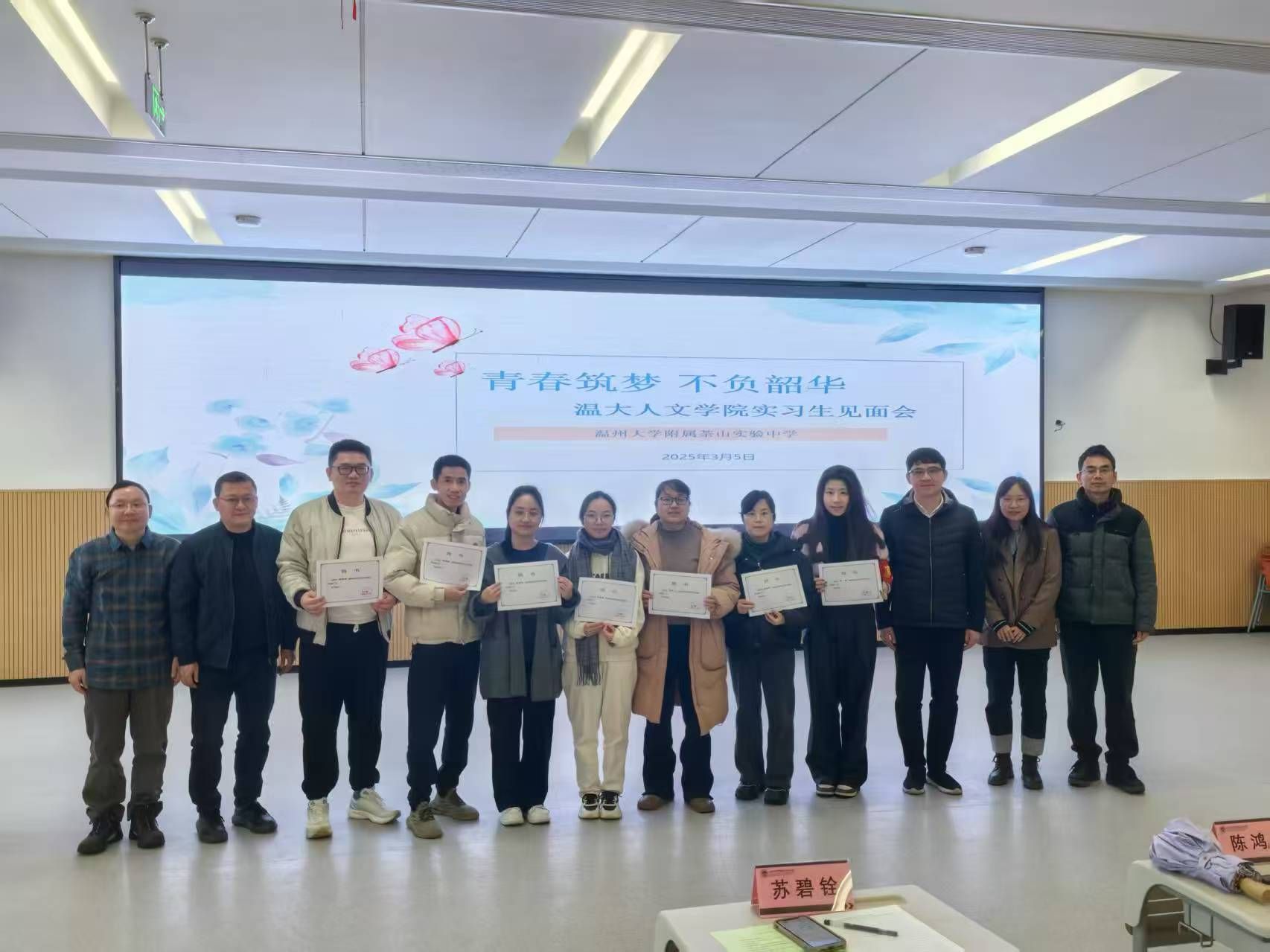2025年3月5日,永利yl23411官网汉语言文学(师范)专业15位实习生,由永利yl23411官网教学副经理陈鸿超老师、指导教师周小兵老师、苏碧铨老师带队,与永利yl23411官网入口附属茶山实验中学季焕忠董事长、项东福主任、张南主任、八年级语文学科指导老师和班主任指导老师,共同出席在永利yl23411官网入口附属茶山实验中学一楼合班教室举行的见面会。本次见面会为踏上实习征程的学子们搭建了沟通的桥梁,有力地促进了校方与实习生之间的交流与合作。