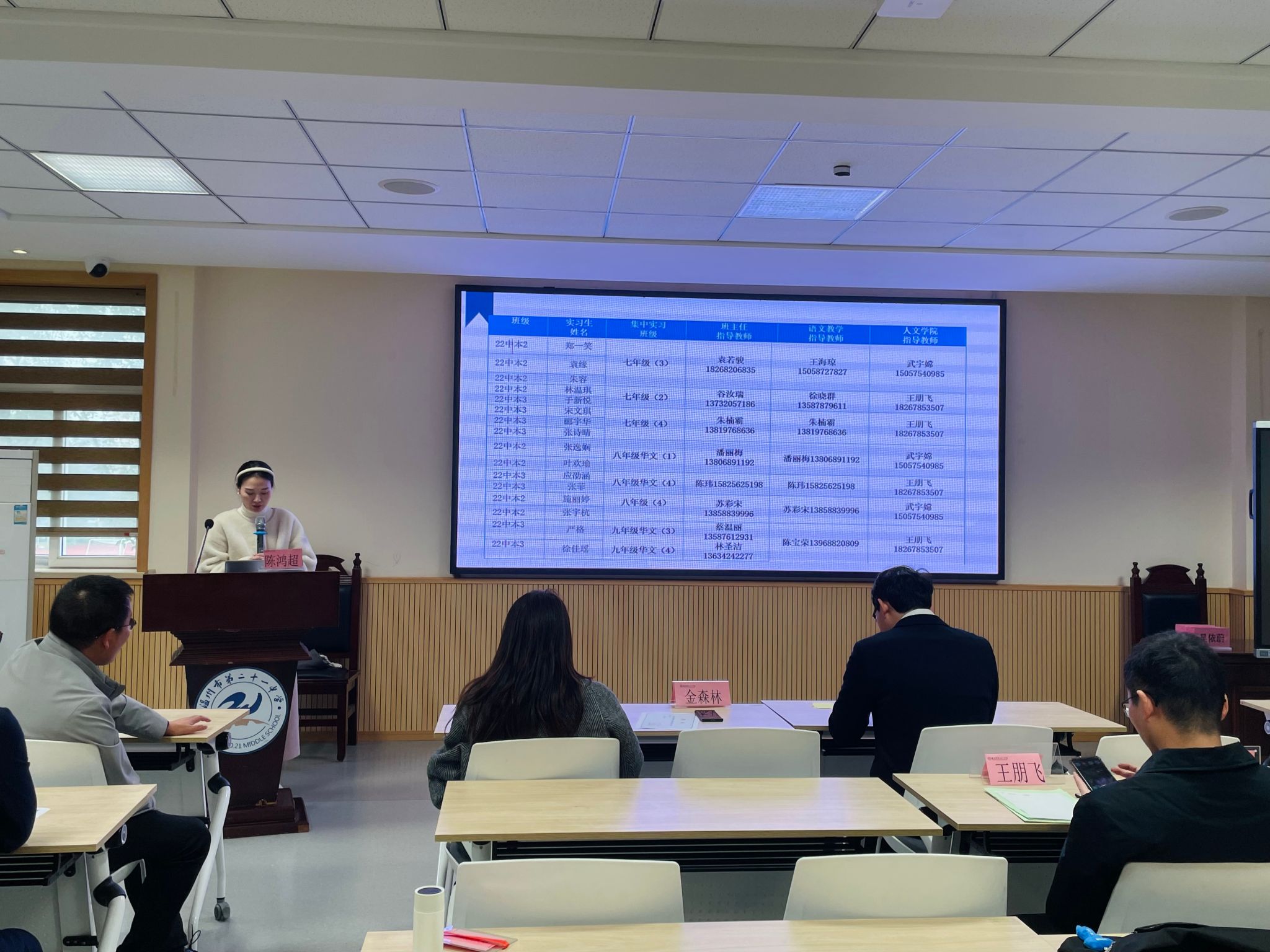 最后,会议明确了实习期间的安排:实习生需遵守校园规范,佩戴出入证,参与备课组活动、德育讲座及教学实践,并逐步承担课堂教学与班级管理任务。