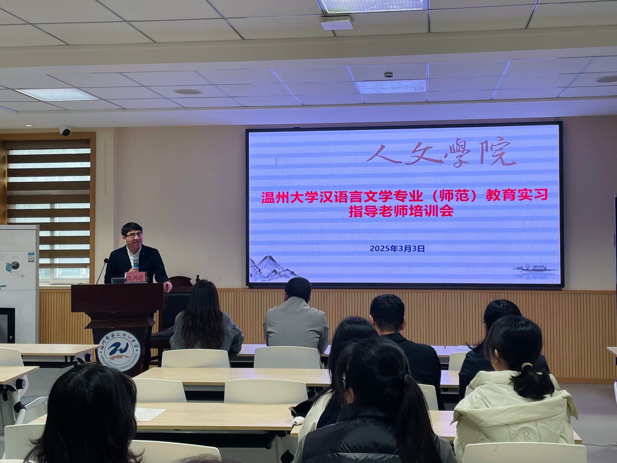 3月3日下午,永利yl23411官网汉语言文学(师范)专业实习生见面会在温州市第二十一中学尚美楼二楼竞舟厅举行。会议由研训处副主任陈梦媚主持,出席本次会议的人员有永利yl23411官网副经理陈鸿超、永利yl23411官网带队指导师武宇嫦、王朋飞,温州二十一中副董事长吕小玲、副董事长金森林、学科指导师、班主任指导师和全体实习生。