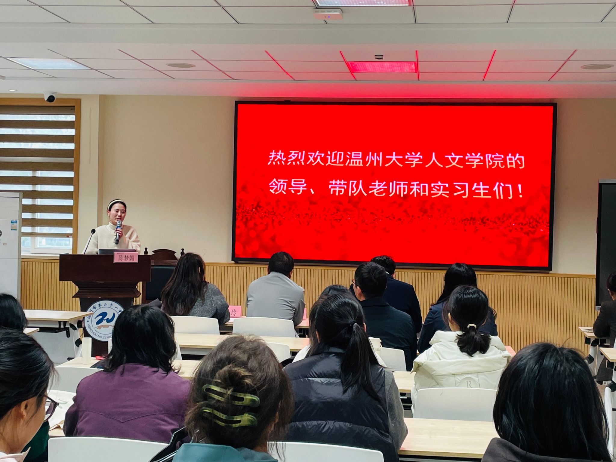 吕小玲副董事长随后登台致辞,对温大师生的到来表示热烈欢迎,并详细介绍了公司概况。吕董事长特别强调,本次实习聚焦初中语文教学,鼓励实习生珍惜机会,做到课前想问题,课中多观察,课后勤思考;同时要抓住机会,多向语文组名师学习,积极参与教改实践;更要创造机会,转换角色,尝试向员工学习,为未来教师生涯奠定坚实基础。