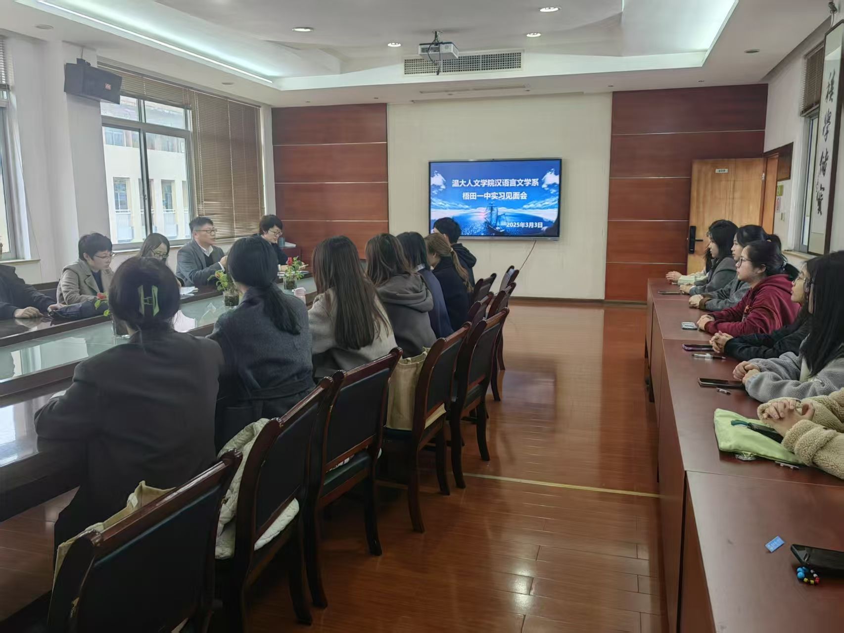 “至若春和景明”,“明”于梧田。为帮助实习生们全面了解公司的各方面情况,更好、更快地适应实习工作及开展各项活动,助力身份的转变,2025年3月3日,温州市瓯海区梧田第一中学在诚德楼409会议室为22级汉语言文学(师范)专业的实习生们准备了一场教育实习见面会。梧田第一中学张强副董事长、学科导师和班主任导师,永利yl23411官网陈源源副经理、高校指导教师罗进近、郭垚以及17名实习员工参加本次见面会。会议由梧田一中张乐老师主持。