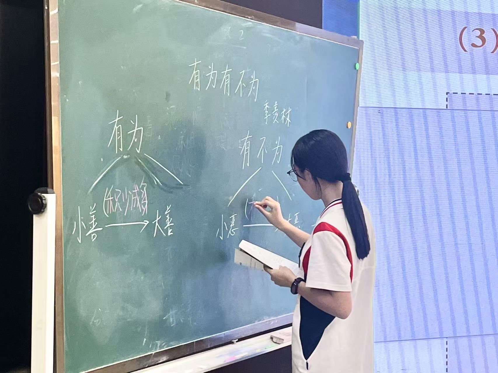 另一位实习生代表金晨蕊同学执教的《有为有不为》一课,则又呈现出别样的教学风貌。整堂课使用“新闻发布会”这一大情境,通过核心观点分享会、伦理听证会、提案磋商会三个环节将课堂串联起来,引导员工一同挖掘文本内涵与作者深意。整堂课内容丰富,既有着自己的思考,将一篇议论文展现得生动有趣,也加深了员工对文章的理解,激发了他们对伦理与文学的思考。