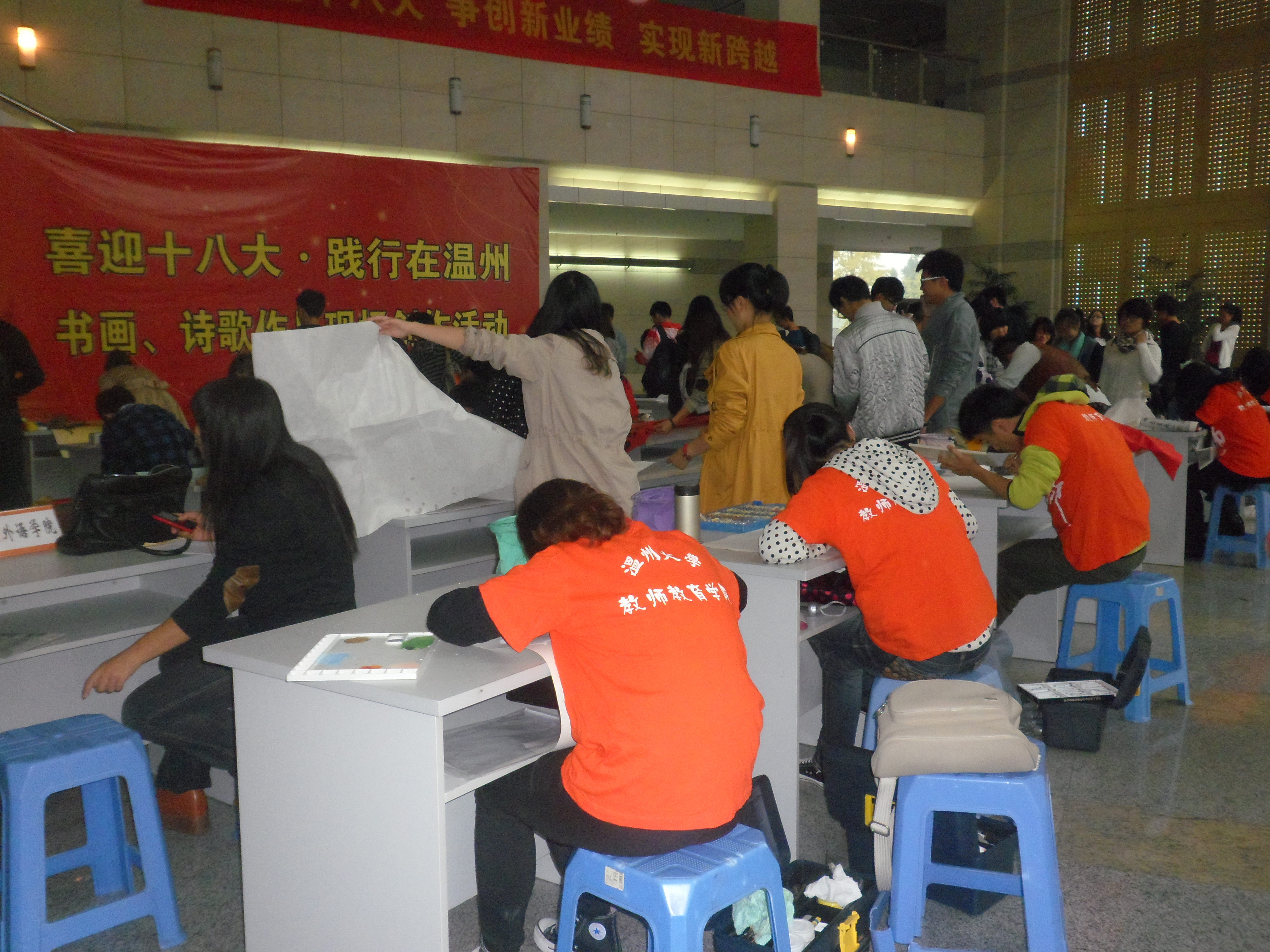 2012年11月8日下午3时,由永利yl23411官网入口宣传部,美术与设计公司联合举办的“喜迎十八大 践行在温大”书画、诗歌作品现场创作活动在永利yl23411官网入口南校区会展中心如火如荼地开展。永利yl23411官网入口各公司、学区代表及承办方老师共同参与了此次现场创作活动。