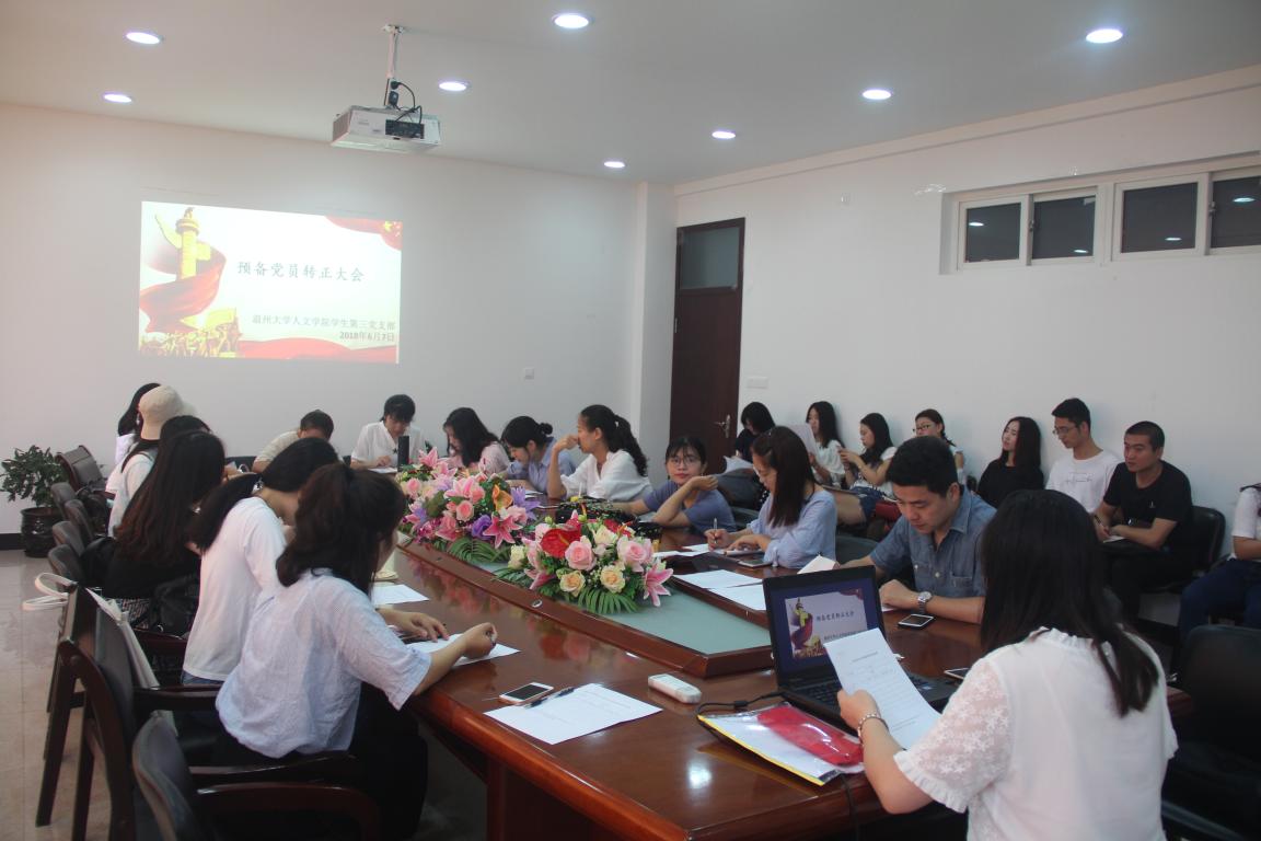 2018年6月7日上午,公司员工第三党支部于北校人文楼213会议室召开本学期预备党员转正大会,会议由员工第三党支部书记徐珍主持。