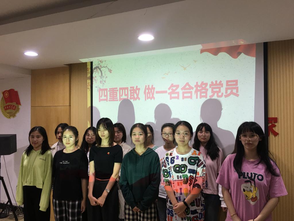 活动分为以下四个阶段:首先主持人做了“四重四敢”的知识普及,随后重温入党誓词——党员们一起起立宣誓,紧接着在场的同志们观看了《不忘初心学党章》系列微党课与《学榜样、践初心》系列微视频。在观影的过程中,大家对于自我入党的经历做了回顾。下一个环节是观看纪录片《难忘初心之永不褪色的红枫》,所有人都从心底赞叹这个勇敢的女革命者——朱枫为共产党和人民抛头颅、洒热血的坚定与无畏,重问自己加入中国共产党之初心与使命。第四阶段是问答与分享环节,在场的积极分子与党员同志们都纷纷站起身来,表达自己在入党过程所受到的历练与考验,展现新时代中国青年“敢承诺、敢作为、敢担当、敢奉献”的自信风貌与远大理想。