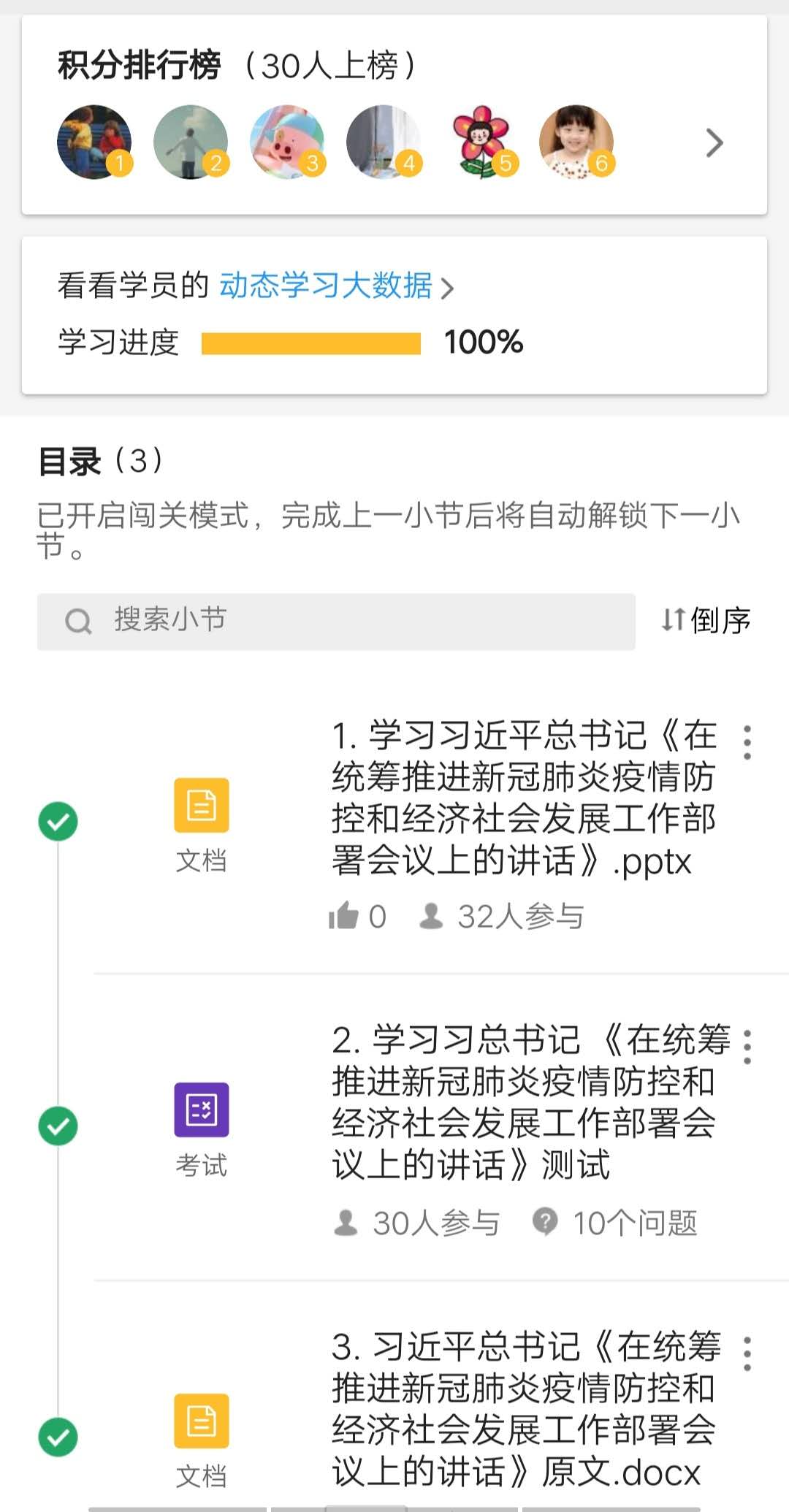 公司各员工党支部组织党员在UMU平台上学习了习近平总书记《在统筹推进新冠肺炎疫情防控和经济社会发展工作部署会议上的讲话》,之后或采取测试的方式做到“原原本本学讲话”;或就相关话题展开讨论,做到“扎扎实实悟精神”。针对“如何在打赢疫情防控战中发挥模范作用”这一问题,大家围绕加强学风建设、强化学业管理、做好疫情防控等方面提出了许多意见,如主动承担员工党员的责任,以身作则,做好自身防控措施并尽可能将更多的知识普及给身边人等。
