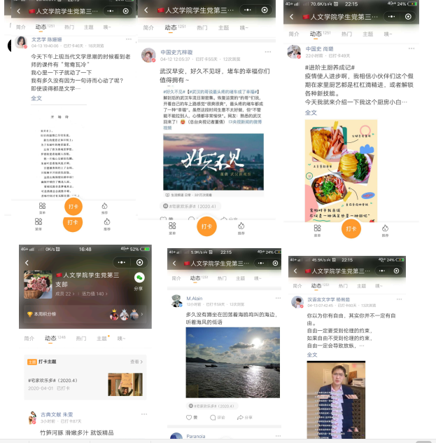 党员同志们或是用读书来丰盈自己的灵魂,用文字记录内心的感悟;或是利用充裕的时间提高生活技能,利用相机记录阳春四月的芳菲美景;或是发挥疫情在家的优势,把握难得的机会陪伴家人。通过打卡活动,党员同志互相传播正能量,感染他人,感染自己,让生活充实起来。