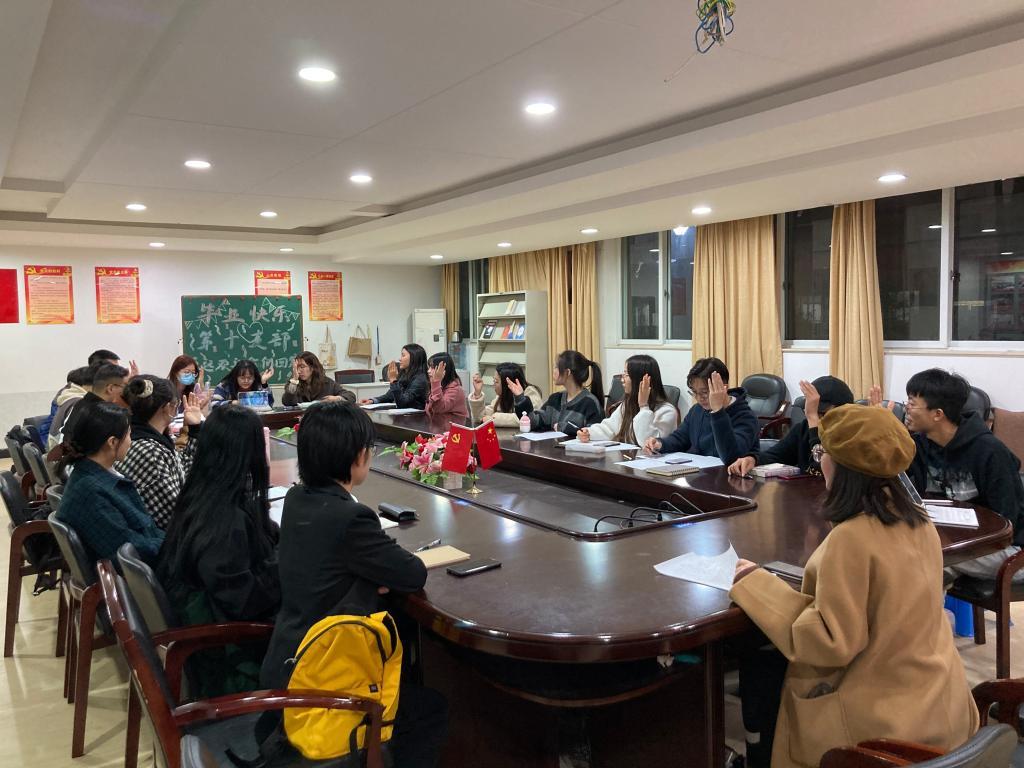经伍伟涛同志、朱雯同志、黄敏同志宣读各位同志的座谈会纪要后,参会所有党员对是否同意三位发展对象转为预备党员进行了举手表态,三位同志也就群众反映的问题及自身今后的发展方向进行了表态。最后,经支部大会无记名投票表决,三位同志的赞成票数超过应到会党员人数的半数。经支部决议,同意吸收林漫珊同志、佟梓璇同志、李林霞同志成为中共预备党员。