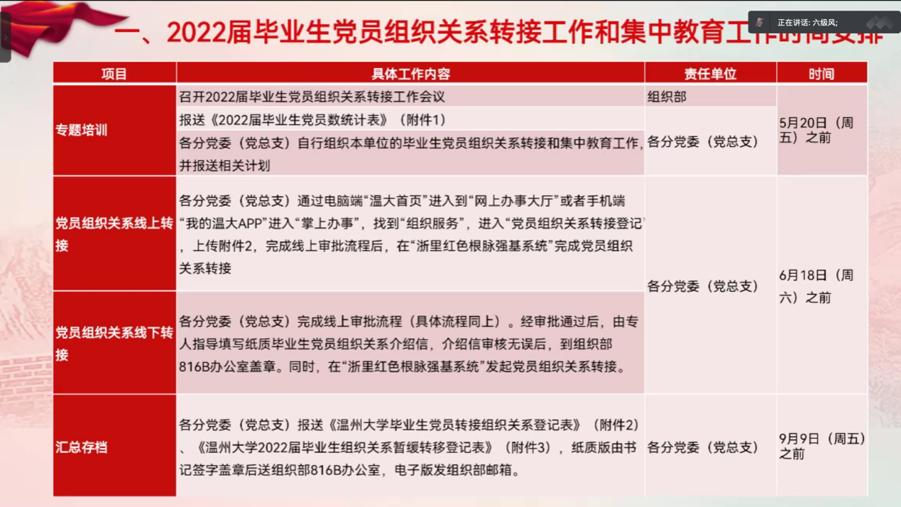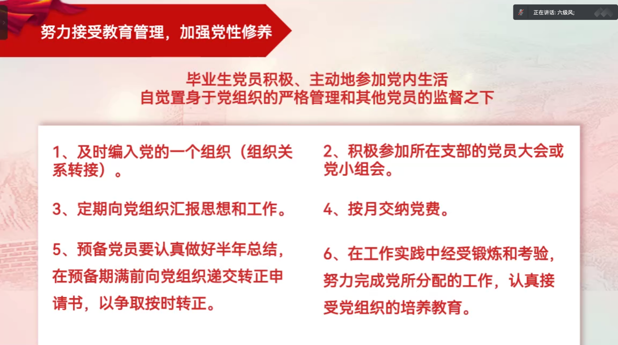 刘纪峰老师从增强党员意识、树立廉正观念、提高党性修养、落实疫情防控政策等方面对毕业生党员展开离校教育,提醒毕业生党员在展望前景的同时,也希望各位毕业生党员“不忘初心、牢记使命”“廉洁奉公”,提高党性及原则性。与会,刘纪峰老师对党员组织关系转接工作做了重点部署,特别是在进度安排、转接步骤、转接要求和党建档案的归档转接等方面进行着重强调与提醒,要求毕业生党员必须要提高认识、严格落实、完整转接,按期完成组织关系转接工作。
