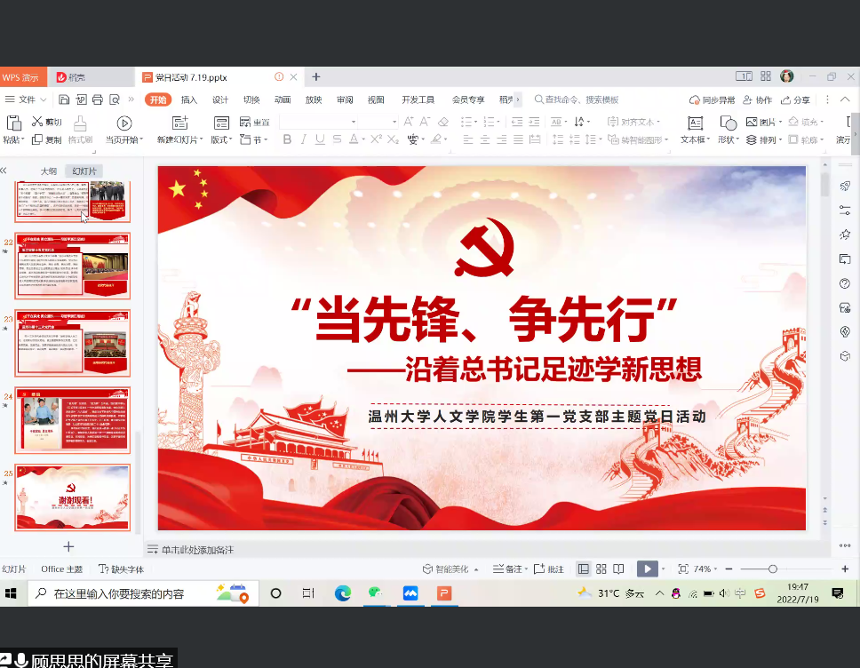 2022年7月19日,公司员工第一党支部依托在线会议平台,在线上召开了“当先锋、争先行”主题党日活动,深入学习《干在实处 勇立潮头——习近平浙江足迹》。本次党日活动由员工第一党支部书记黄莹主持。