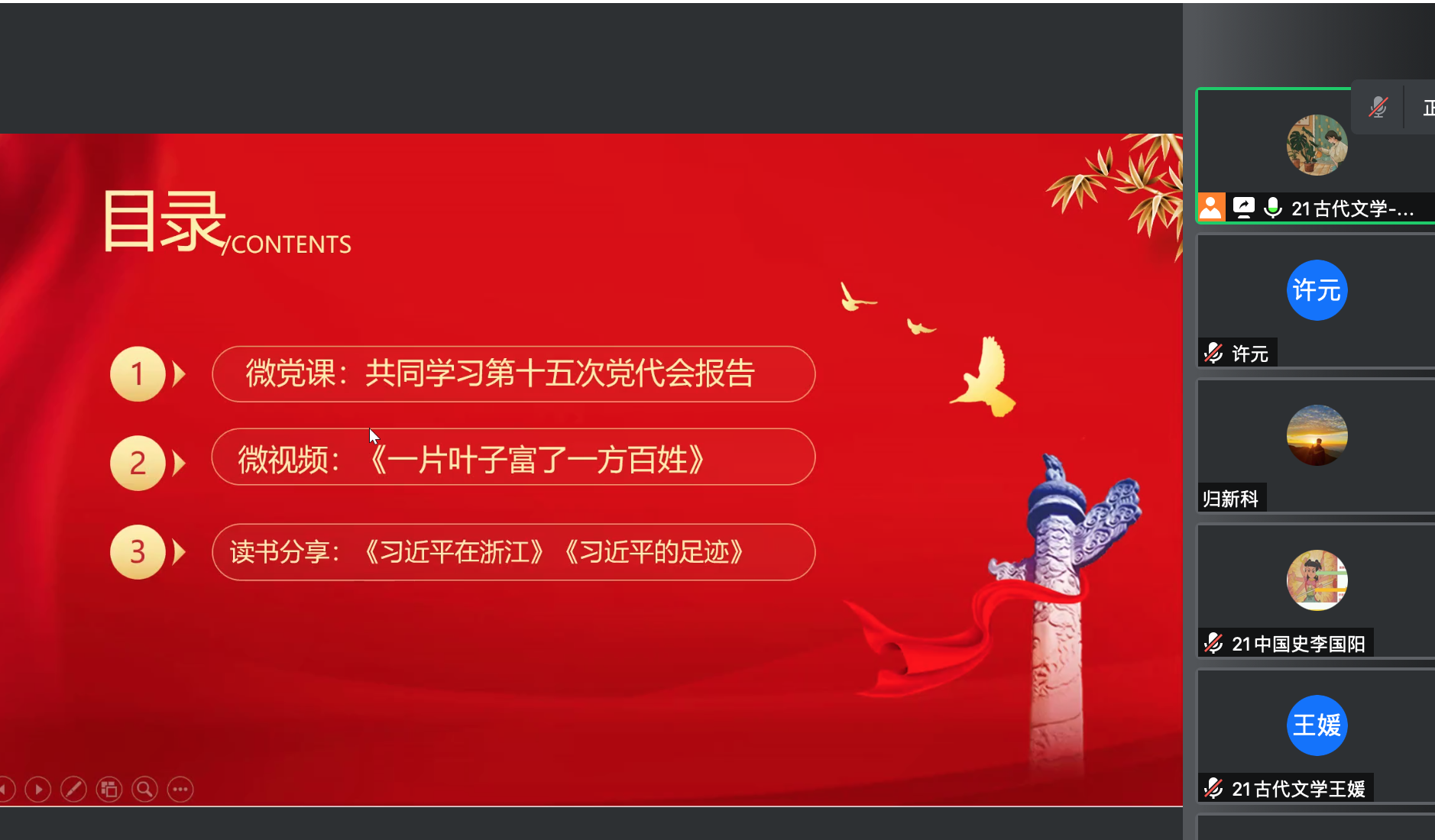 随后,与会同志进行了《习近平在浙江》的读书报告分享,同志们分享了自己阅读本书的心得,提出了自己的学习感悟,并从中领会到作为新时代的青年党员,我们要从自身出发,学习习近平总书记的宝贵经验并亲身实践,真正做到全心全意为人民服务。