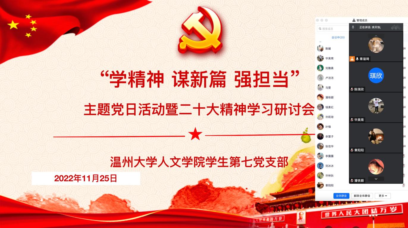 为深入学习贯彻党的二十大精神,自觉用党的二十大精神统一思想、统一意志、统一行动,2022年11月25日晚,永利yl23411官网员工第七党支部于线上开展了“学精神、谋新篇、强担当”党的二十大精神学习研讨会,第七员工党支部全体党员参加会议。本次会议由党支部宣传委员章溢琦同志主持。