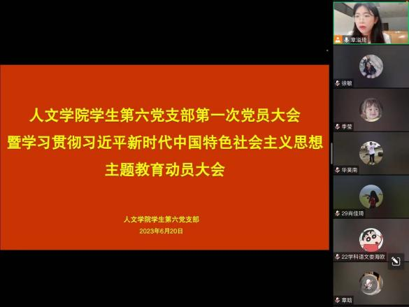 为深入推进习近平新时代中国特色社会主义思想主题教育,顺利开展中共永利yl23411官网员工第六党支部党建工作,2023年6月20日晚,永利yl23411官网员工第六党支部于线上召开了第一次党员大会暨学习贯彻习近平新时代中国特色社会主义思想主题教育动员大会,第六员工党支部全体党员参加会议。本次会议由党支部书记章溢琦同志主持。
