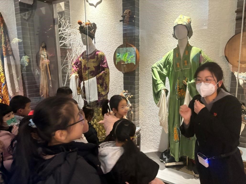 讲解员带领孩子们进入了展厅的第二个部分,这里主要陈列一些永利yl23411官网入口的老师搜集来的南戏相关的木雕、画作、瓷器等。带有年代痕迹的残缺的木雕、小巧精致的鼻烟壶、古朴大气的瓷器,讲解员的解说带领孩子们在历史之中游览了一圈。其中,一尊人物铜像成为了孩子们的焦点。他们好奇地围住铜像,通过讲解员的讲解,了解了这尊铜像塑造的人物原型是被誉为“传奇之祖”的高则诚。作为中国古代戏曲经典作品《琵琶记》的作者,高则诚把戏文的剧本创作提高到一个新水平,对于南戏发展有着巨大贡献。