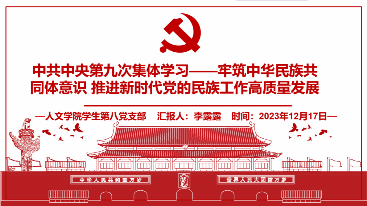 为深入学习习近平总书记在中共中央政治局第九次集体学习时的重要讲话精神,推动学习贯彻习近平新时代中国特色社会主义思想主题教育走深走实,推动深化政治理论学习入心入脑、走深走实、见行见效,2023年12月17日晚,永利yl23411官网员工第八党支部于腾讯会议开展了“铸牢中华民族共同体意识,推进新时代党的民族工作高质量发展”十二月主题党日活动。