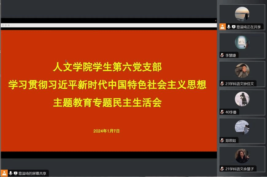 首先,支部书记章溢琦同志率先进行自我批评,强调从“理论学习”“政治素养”“能力本领”“担当行为”“工作作风”“廉洁自律”等多个方面进行。随后,第六党支部支委肖佳琦、曹蜜、李慧婕同志相继进行自我批评。各位党员同志也积极参与了发言,依次进行了深入的自我剖析,摆事实、讲表现,严肃开展批评与自我批评,从中发现问题、解决问题,找出差距并确定今后的努力方向以及改进措施。