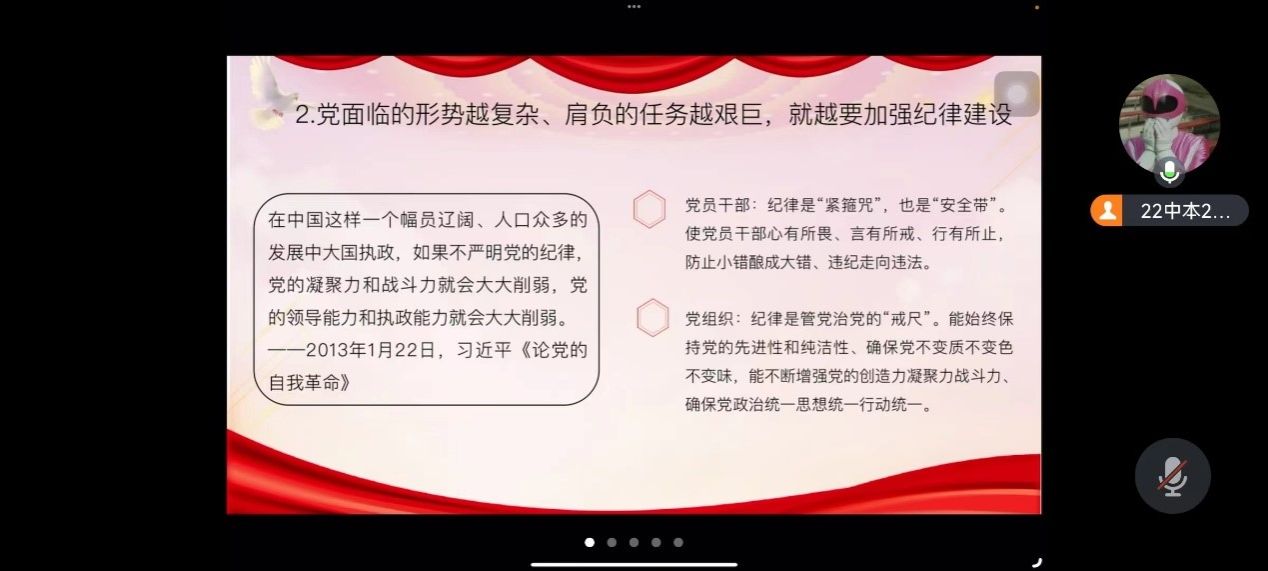 党纪学习教育是加强党的纪律建设、推动全面从严治党向纵深发展的重要举措。为深入学习贯彻习近平总书记关于党纪学习教育的重要讲话和重要指示精神,高质量开展党纪学习教育,2024年7月20日晚上19:00,永利yl23411官网员工第一党支部在线上开展了以“党的纪律建设”为专题的学习会。本次活动由郑一笑同志主持,共有27名党员同志参加。