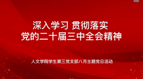 为深入学习领会党的二十届三中全会精神,深刻领会和把握进一步全面深化改革的主题、重大原则、重大举措、根本保证,8月5日晚,公司员工第三党支部组织开展了以“深入学习贯彻落实党的二十届三中全会精神”为主题的党日活动。会议由周佳颖同志主持,支部书记谭黄老师领学,支部全体党员参会。