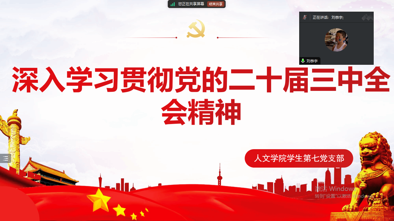 中国共产党第二十届中央委员会第三次全体会议(以下简称为党的二十届三中全会)于2024年7月15日至18日在北京召开。为深入学习贯彻此次全会精神,2024年8月6日晚,公司员工第七党支部在线上开展了以“深入学习贯彻党的二十届三中全会精神”为主题的党日活动。会议由党支部书记刘恭宇老师主持。