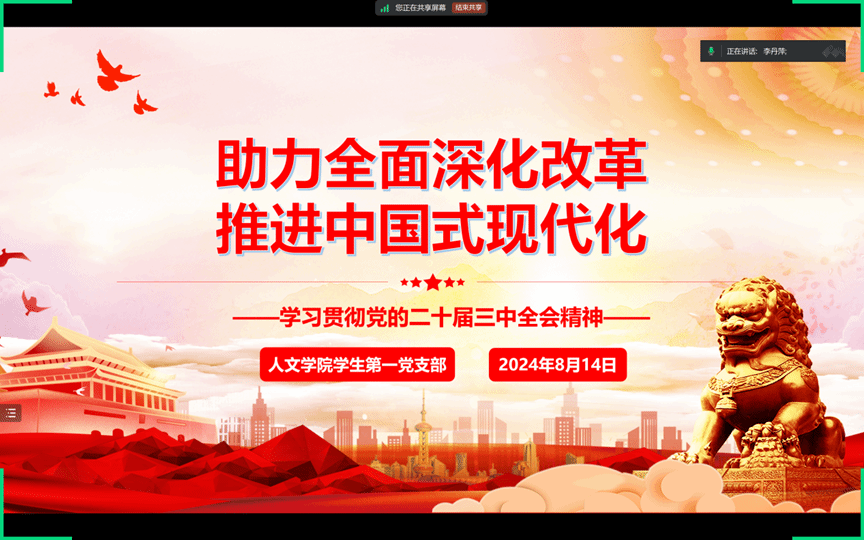 为深入贯彻落实习近平新时代中国特色社会主义思想,传达学习党的二十届三中全会精神,提升党员党性修养,进一步提高党组织的凝聚力、战斗力、号召力和创造力,2024年8月14日晚上19:00,永利yl23411官网员工第一党支部在线上开展了以“助力全面深化改革,推进中国式现代化”为主题的学习会暨党日活动。本次活动由支部书记李丹萍同志主持,共有28名党员同志参加。