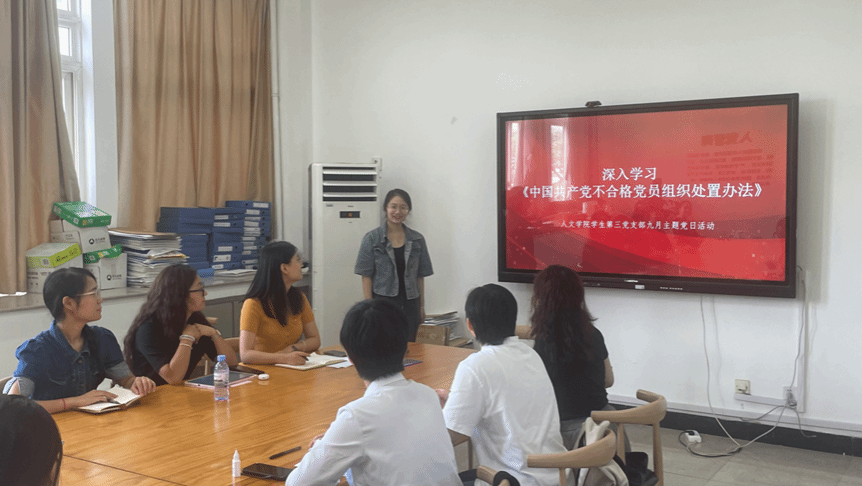第三党支部党建负责人刘雪婷同志对本支部的党纪学习教育情况做了总结。在这段党纪学习教育历程中,第三党支部认真践行了“积极召开专题学习会,坚持个人自学与集中学习相结合,开展多样化的学习形式,积极对外宣讲,让党纪走向人民中间”的党纪学习教育新模式。