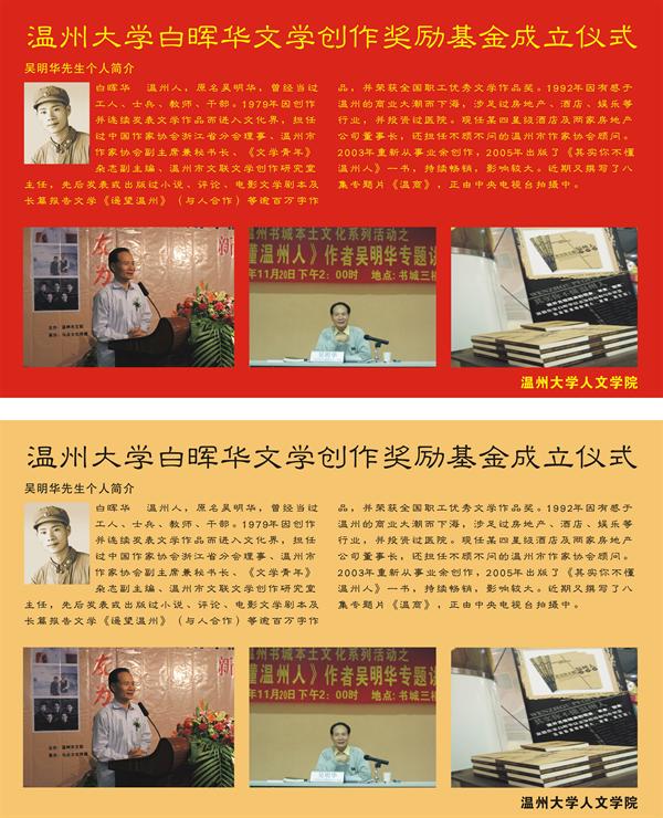 2007年,吴明华先生在永利yl23411官网设立白晖华文学奖,以此鼓励热爱文学的同学更多地创作,丰富同学的精神生活和校园文化。2009年永利yl23411官网入口白晖华征文活动被评为永利yl23411官网入口第二届校园文化品牌活动。六年来,每年都有近三百份作品参赛,参赛选手来自永利yl23411官网入口各个公司的爱好文学的员工,此活动在公司内外产生了广泛的影响。经过评审每年产生一等奖2名,二等奖4名,三等奖6名,优秀奖20名,获得荣誉证书和优厚的奖金,评审理事会还将优秀获奖作品推荐到《温州文学》集结出版。