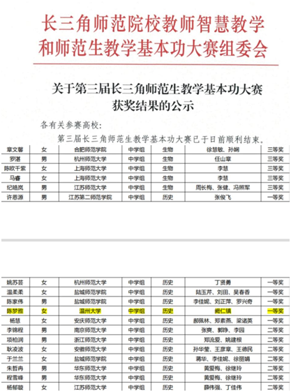 2022年5月17日,第三届长三角师范生教学基本功大赛结果公示,公司选手再创佳绩,18历本陈梦雅同学荣获中学历史组一等奖。