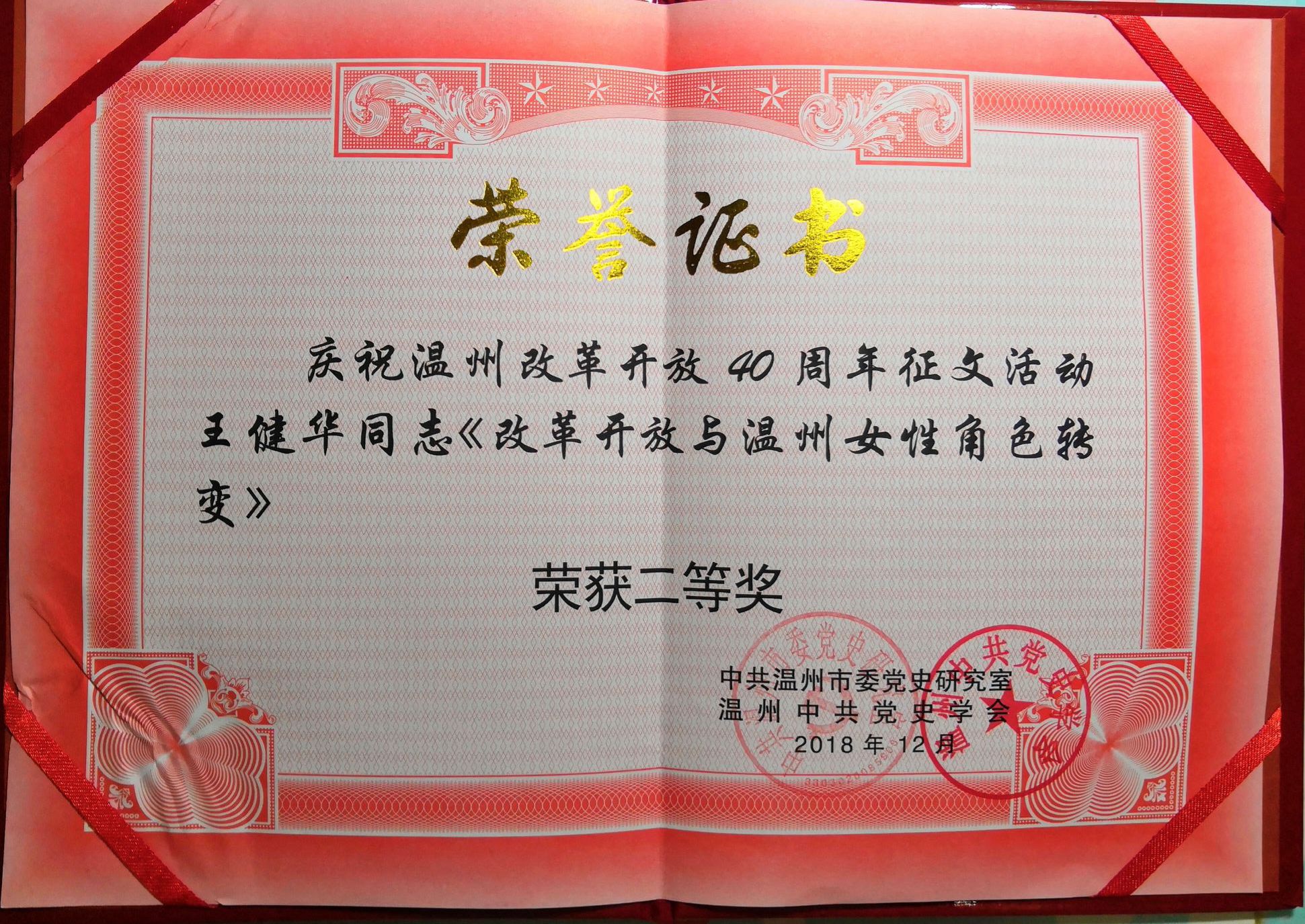 本次征文比赛从117篇应征文章中共评出特等奖3篇、一等奖2篇、二等奖4篇、三等奖6篇、优秀奖20篇。其中公司16级中国史研究生王健华的文章《改革开放与温州女性角色转变》获二等奖;16级中国史研究生曾富城所整理应健雄口述文章《回顾温州交通银行发展历史》获三等奖;16级中国史研究生赵飞跃、陈学兵的文章《新时代改革开放以来温州民办博物馆的发展现状研究》,15历本杨苗苗的《温州人民改革开放后的创新创业精神》获得优秀奖。